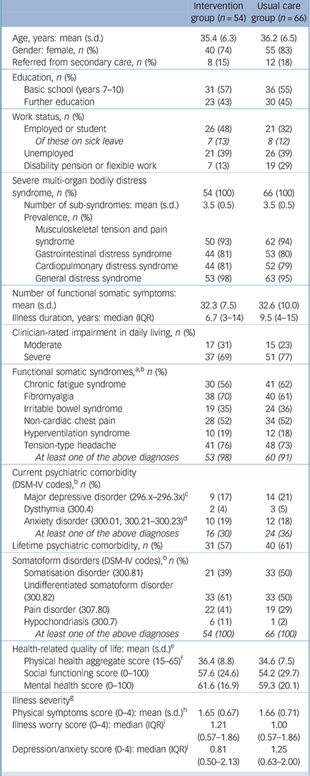 Between March 2005 and December 2006 the case notes of all patients referred were screened for eligibility. People who were considered likely to meet inclusion criteria were invited to undergo a clinical assessment to determine eligibility. To be eligible for participation individuals had to have a chronic (i.e. of at least 2 years duration) bodily distress syndrome of the severe multi-organ type, which requires functional somatic symptoms from at least three of four bodily systems, and moderate to severe impairment in daily living. Reference Fink, Toft, Hansen, Ornbol and Olesen18,Reference Fink and Schröder19 This unifying definition captures most patients with severe functional somatic syndrome diagnoses, Reference Fink and Schröder19 and has a prevalence of 3–4% in both primary and secondary care. Reference Fink, Toft, Hansen, Ornbol and Olesen18 We included only adults aged 20–45 years, as we regarded the possibility of improvement to be lower in older people and the exclusion of disease to be more difficult. Patients with severe psychiatric morbidity (psychotic and bipolar disorders, alcohol or drug misuse) were also excluded, although we did include people with other psychiatric disorders (e.g. anxiety, depression) and medical disorders (e.g. diabetes, asthma) if these conditions did not explain the somatic symptoms. For practical reasons we excluded people involved in litigation, those who were pregnant and those who were not fluent in the Danish language (operationalised as non-Scandinavian origin).