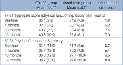 A randomised controlled trial (clinicaltrials.gov, NCT00132197) compared STreSS (nine 3.5 h sessions over 4 months, n = 54) with enhanced usual care (management by primary care physician or medical specialist, n = 66). The primary outcome was improvement in aggregate score on subscales of the 36-item Short Form Health Survey (physical functioning, bodily pain and vitality) at 16 months.