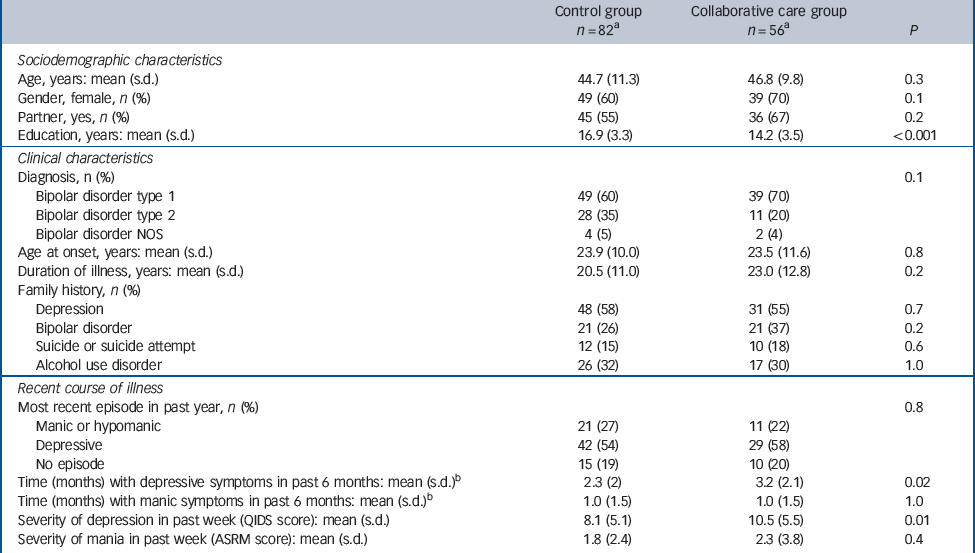 A total of 138 participants were included (Fig. 1). Initially, informed consent was obtained from 71 participants in the intervention group and from 82 participants in the control group. However, due to organisational circumstances unrelated to the study, two teams with in total 15 patients withdrew from the experimental arm of the study, leaving 56 patients in the collaborative care arm and 82 in the control arm. After the baseline measurement 13 patients in the collaborative care condition stopped the allocated treatment, of whom 2 continued to participate in the study, leaving 11 patients not assessed at T 12. Four patients in the control condition stopped allocated treatment, of whom two continued to participate in the study. In total 21 participants were lost to follow-up (controls n = 10, intervention n = 11). Of the 45 patients in the collaborative care group at the 12-month assessment 43 received the allocated intervention, and of the 72 patients who completed the study in the TAU group 70 received the allocated intervention. When the baseline characteristics of patients who left the study were compared with those who continued, these groups differed significantly only with respect to family history of bipolar disorder. Logistic regression was conducted to determine whether illness characteristics in patients randomised to collaborative care predicted withdrawal from the care programme. Only longer duration of mania symptoms in the 6 months preceding baseline predicted stopping collaborative care.