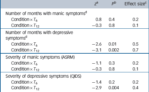 Table 2 shows observed means and standard deviations of number of months spent with manic or depressive symptoms, as well as severity of symptoms. Table 3 shows the results of mixed-models analyses. After 6 months patients in collaborative care demonstrated a larger reduction in the number of months with depressive symptoms than patients in the TAU group, with a medium effect size (z = –2.6, P= 0.01, d= 0.5). After 12 months this reduction was even larger (z = –3.1, P= 0.002, d= 0.7). Severity of depressive symptoms improved more after 12 months in patients who received collaborative care, compared with patients treated as usual (z = –2.9, P= 0.004, d= 0.4). There was no significant difference between the two conditions in time with mania symptoms or in change in severity of mania symptoms over 12 months.