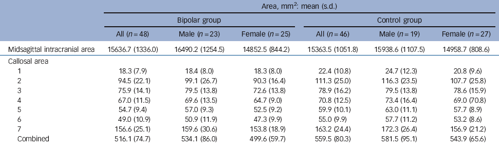 Callosal total midsagittal area correlated positively with intracranial midsagittal area (control group: r = 0.469, P= 0.001; bipolar group: r = 0.436, P = 0.002; all participants: ρ = 0.357, P<0.001). This was entered as a covariate in further analysis.