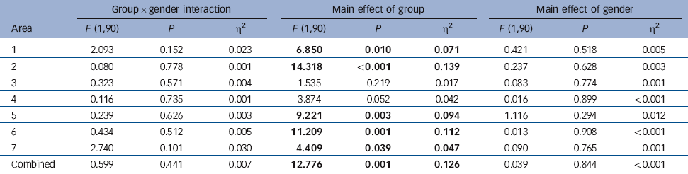 | Area | F (1,90) | P | η2 | F (1,90) | P | η2 | F (1,90) | P | η2 |