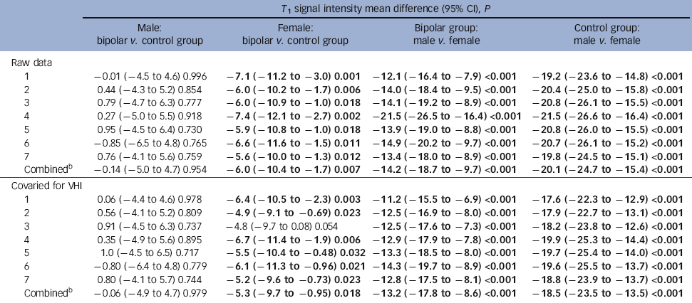 There was a significant group×gender interaction for raw signal intensity for area 1 (F = 5.3, P = 0.024), area 2 (F = 4.0, P = 0.048) and area 4 (F = 0.039, P = 0.034). When VHI was entered as a covariate, the interaction remained significant in area 1 (F = 4.4, P = 0.038) but with area 2 (F = 3.0, P = 0.085) and area 4 (F = 3.9, P = 0.051) having only a trend towards significance. Adding HRSD as an additional covariate resulted in marginal reductions in P-values, with area 7 becoming significant for raw data (F = 4.4 P = 0.038) and, following correction for VHI, area 4 remaining significant (F = 4.4 P = 0.039) and area 7 just reaching significance also (F = 3.9 P = 0.05). These data were further investigated with a simple main effects model: men had significantly lower signal intensity than women in both diagnostic groups (Table 5). Interestingly, although there was no significant effect of diagnosis on callosal signal intensity in men, women with bipolar disorder had significantly lower signal intensity than women in the control group across all areas. Entering VHI as a covariate made little difference to this pattern of results, although some reduction in significance level was observed (Table 5). The inclusion of HRSD scores as an additional covariate resulted in minor changes only in P-values, with no alteration to the pattern of significance of results.