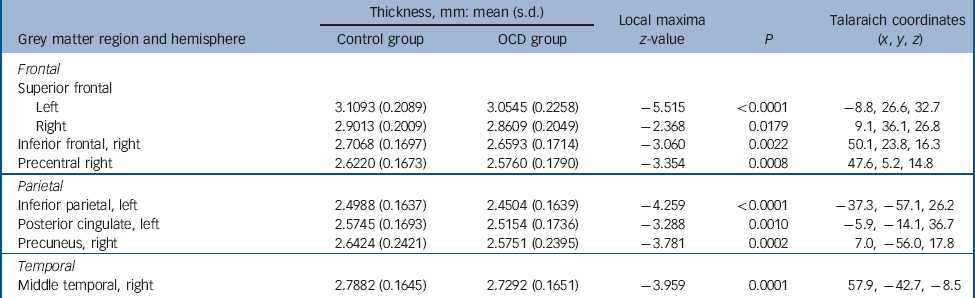 Table 1 Areas of decreased cortical thickness in the obsessive–compulsive disorder (OCD) group (n = 412) compared with the control group (n = 368) a