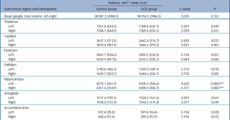 Table 2 Subcortical regional volumes in the obsessive–compulsive disorder group (n = 412) compared with control group (n = 368) a