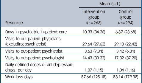 At each study assessment, patients completed the Patient Health Questionnaire-9 (PHQ-9),Reference Gensichen, von Korff, Muth, Peitz, Beyer and Guethlin13 a 9-item questionnaire on depressive symptoms, as well as the EQ-5D.15 The EQ-5D is a simple questionnaire for the subjective description of perceived state of health. It also provides a preference-based utility score (EQ-5D index) for each of the EQ-5D health states with the best state (perfect health) and ‘death’ being assigned values of 1 and 0, respectively.Reference Dolan16 In addition, patients completed a questionnaire on healthcare utilisation (including psychiatric in-patient care, out-patient care provided by psychologists, psychiatrists and family doctors/GPs as well as antidepressant drug use) and lost work days in the 12 months preceding the interview. Additional utilisation data were collected from the patients' medical records. Thirteen intervention practices were randomly selected to assess intervention costs using a structured questionnaire.
