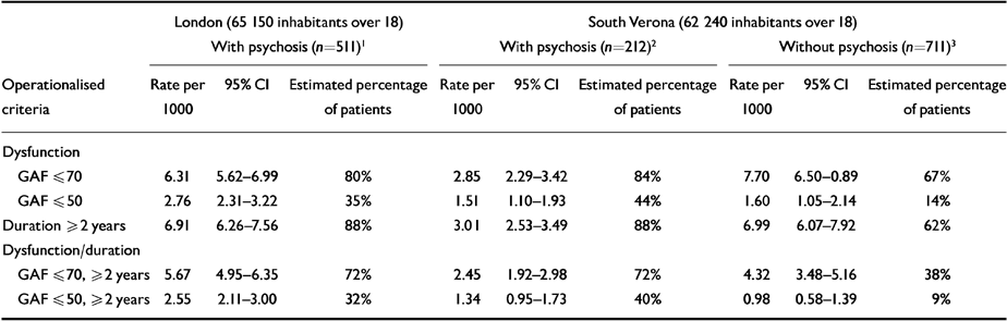 The results show that in patients with psychosis, the more restrictive criterion for severity of illness is the high severity of dysfunction (a GAF score of 50 or less), since the majority of patients with psychosis had a long duration (88% in both areas) and at least a moderate (a GAF score of 70 or less) level of dysfunction (80% and 84% in London and Verona, respectively).