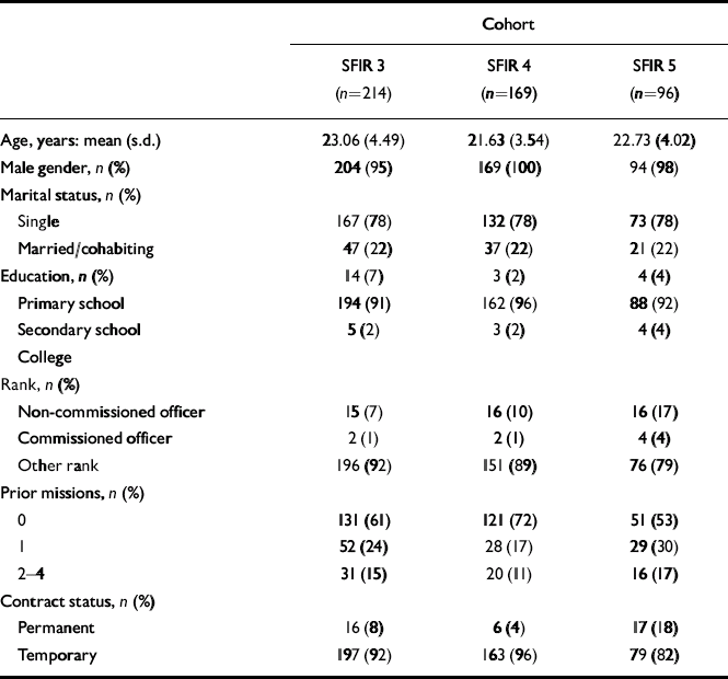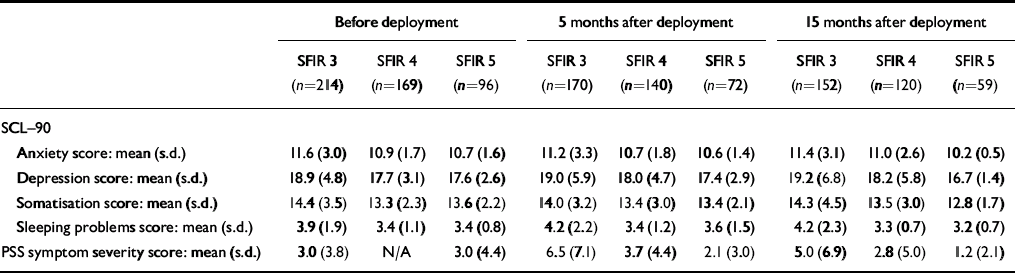 Table 1 shows the characteristics of the three cohorts. The SFIR 3 and 5 cohorts were older than SFIR 4 and had more prior deployments. The SFIR 5 cohort had more officers. About 5 months after deployment, 382 (80%) soldiers completed questionnaires and 339 (71%) took part in the SCID. At about 15 months, 331 soldiers (69%) completed questionnaires and 203 (42%) did the SCID. Given the low response rates, the SCID data at 15 months are not considered. Soldiers who did not complete questionnaires at 5 months had slightly more prior missions than those who did. There were no significant differences on other pre-deployment measures. Responders and non-responders at 15 months did not differ on variables assessed earlier. We therefore treated the drop-outs as occasions missing at random.