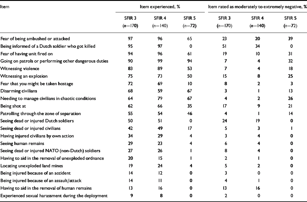 About 6 weeks before their deployment, 481 Royal Netherlands Army troops were asked to participate in this study. They were from three infantry battalions that rotated successively in three deployment phases, each lasting about 4 months, designated Stabilisation Force Iraq (SFIR) 3, 4 and 5. These took place from 15 March 2004 to 15 March 2005. During this period, about 4990 Dutch soldiers were deployed to Iraq. They sustained two casualties. An Armoured Infantry Battalion was deployed on SFIR 3, and two battalions of the Air Assault Brigade were deployed on SFIR 4 and 5. Their main duties were to create and maintain stability and peace, and assist in reconstruction. At various sites, troops available during their preparation programme were told about the aim and general procedures of the study by their commanding officers. They met the principal investigator (I.M.E.) or research assistant a few days later, who gave full (oral and written) information about the study. Participation was voluntary without financial compensation. Participants were told that commanders would be informed only about pooled results. Two soldiers refused and 479 agreed to participate, including 214 SFIR 3 soldiers, 169 SFIR 4 soldiers and 96 SFIR 5 soldiers.