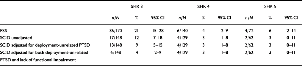 | SCID adjusted for deployment-unrelated PTSD | 13/148 | 9 | 5-15 | 4/129 | 3 | 1-8 | 2/62 | 3 | 0-11 |