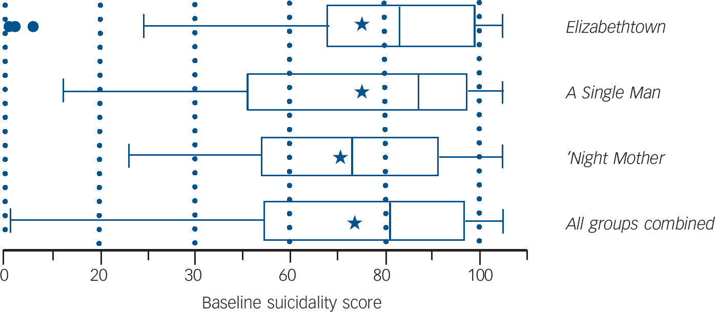 There was no significant difference with regard to baseline suicidality (i.e. suicidality scores before the film screening) among the viewers of the three films (F(2,95) = 0.18, P = 0.83). The distribution of the suicidality scores at baseline for each film group and for all groups combined is shown in Fig. 1.