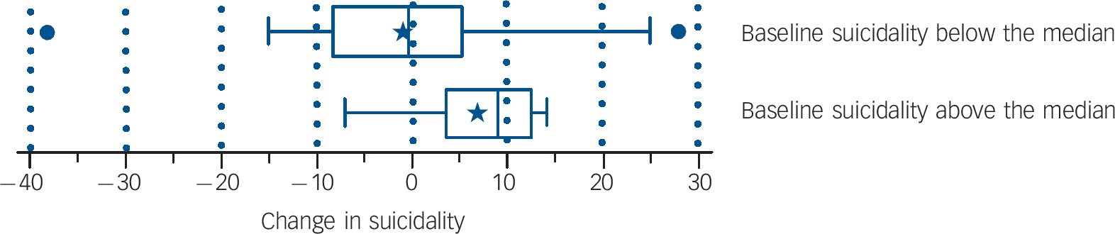 Fig. 2 Distribution of change in suicidality among viewers of ’Night, Mother with lower suicidality and higher suicidality. Boxes represent values between the 25th and 75th percentiles; whiskers represent the upper and lower adjacent values; vertical lines represent the median; * represents the arithmetic mean; and • represents outliers.