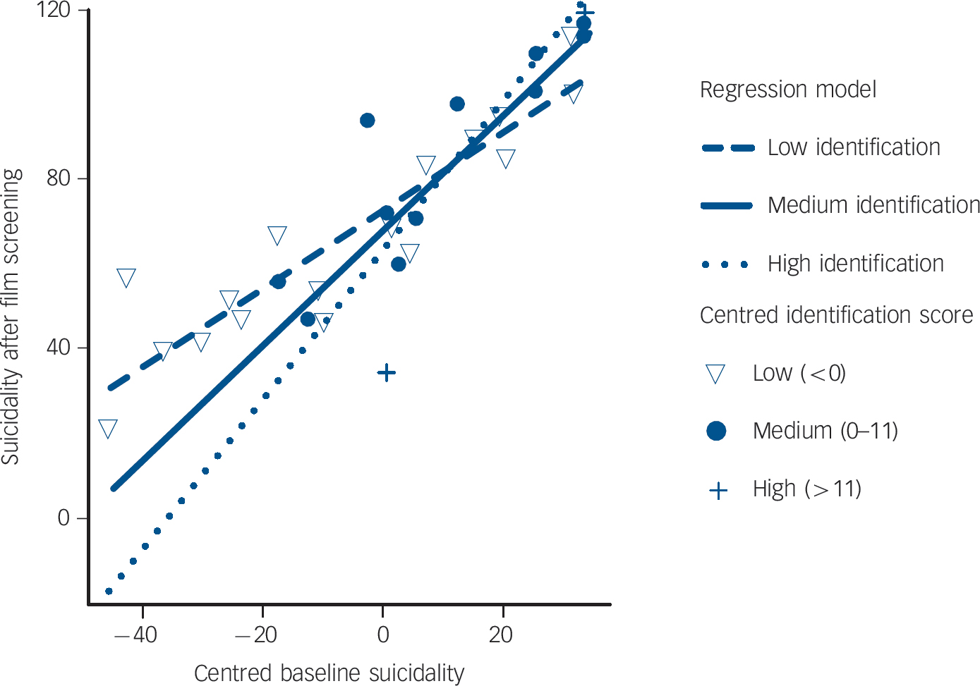 For the film ’Night, Mother, there was a significant interaction effect between identification and baseline suicidality on suicidality after film screening (B = 0.04, s.e. = 0.01, P<0.05) in the regression model (F(3,31) = 44.29, P<0.001, adjusted R 2 = 0.81). The interaction effect is shown in Fig. 3. There was no significant interaction term for the films A Single Man (B = −0.01, s.e. = 0.01, P = 0.59) and Elizabethtown (B = 0.00, s.e. = 0.01, P = 0.79).