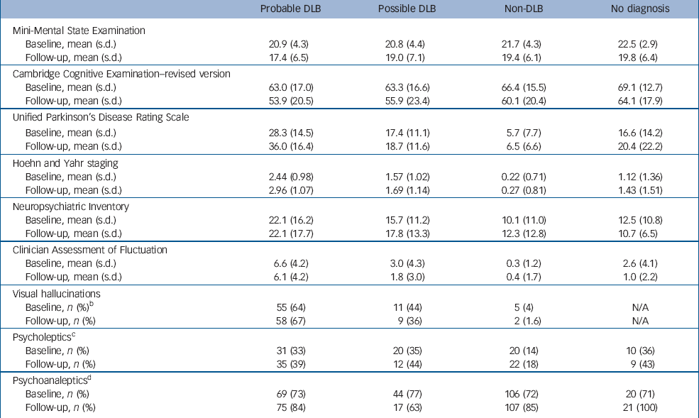 Figure 1 shows the participant profile. Of 325 participants invited for follow-up at 12 months, information was obtained for 264 (81%). Completer status varied slightly between diagnostic groups, with 129 of 147 (88%) in the non-Lewy body dementia group returning for follow-up compared with 72 of 94 (77%) in the probable dementia with Lewy bodies group and 46 of 57 (81%) in the possible dementia with Lewy bodies group. Of 28 (61%) participants with no initial diagnosis, 17 were followed-up. Age and gender did not differ between completers and non-completers. Of 264 participants who completed the 12-month follow-up assessment, 29 were excluded from the analysis (Fig. 1).