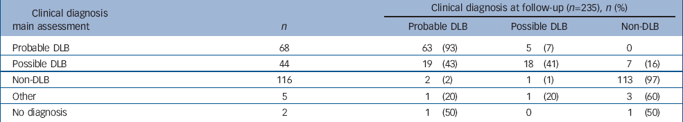 Table 2 shows the comparison between consensus panel diagnosis at follow-up and baseline. Of the 68 individuals with probable dementia with Lewy bodies diagnosed at baseline, most retained their diagnosis at follow-up. In only five people (7%) was the diagnosis revised to possible dementia with Lewy bodies. Similarly, the diagnosis of non-Lewy body dementia showed relative stability. Possible dementia with Lewy bodies was, as anticipated, a more unstable diagnosis. Of the 44 individuals in this group, only 18 (41%) still had a diagnosis of possible dementia with Lewy bodies 1 year later, 26 had a clearer diagnosis at follow-up, 19 of probable dementia with Lewy bodies (43%) and 7 (16%) with non-Lewy body dementia.