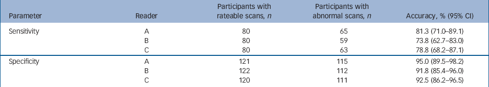 | Parameter | Reader | Participants with rateable scans, n | Participants with abnormal scans, n | Accuracy, % (95% CI) |