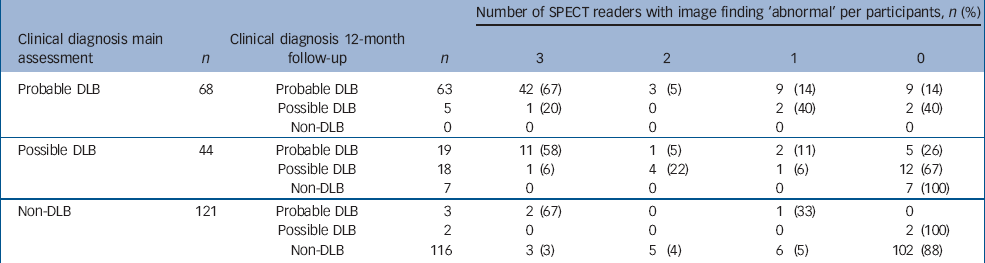 Table 3 shows results of 123I-FP-CIT SPECT ratings against final clinical diagnosis. Sensitivity ranged between 73.8 and 81.3% (mean=78) and specificity between 91.8 and 95.0% (mean=93.1). These findings are similar to those reported in the initial study (sensitivity mean, 77.7%; specificity, 90.4%). Reference McKeith, O'Brien, Walker, Tatsch, Booij and Darcourt5 The results of the scan ratings and final panel diagnoses are shown in Table 4. Of note is the possible dementia with Lewy bodies group, which was not included in the primary analysis of the baseline data. Nineteen participants diagnosed with possible dementia with Lewy bodies at baseline had their diagnosis revised to probable dementia with Lewy bodies at follow-up. Of these, 12 had an abnormal scan (as rated by at least two of the raters). By contrast, seven individuals were diagnosed with non-Lewy body dementia at follow-up, and all had normal scans. Although numbers are small, it is striking that 2 of the 3 individuals diagnosed with non-Lewy body dementia initially but who at follow-up were diagnosed with probable dementia with Lewy bodies had abnormal scans v. only 3 of 116 whose diagnosis of non-Lewy body dementia remained at follow-up. Similarly, only 1 of the 5 (20%) individuals in the probable dementia with Lewy bodies group who became a possible at follow-up had an abnormal scan, compared with 42 of 63 (67%) participants who remained in the probable dementia with Lewy bodies group. An abnormal scan, therefore, was predictive of an individual either keeping a diagnosis of dementia with Lewy bodies or the diagnosis becoming probable dementia with Lewy bodies.