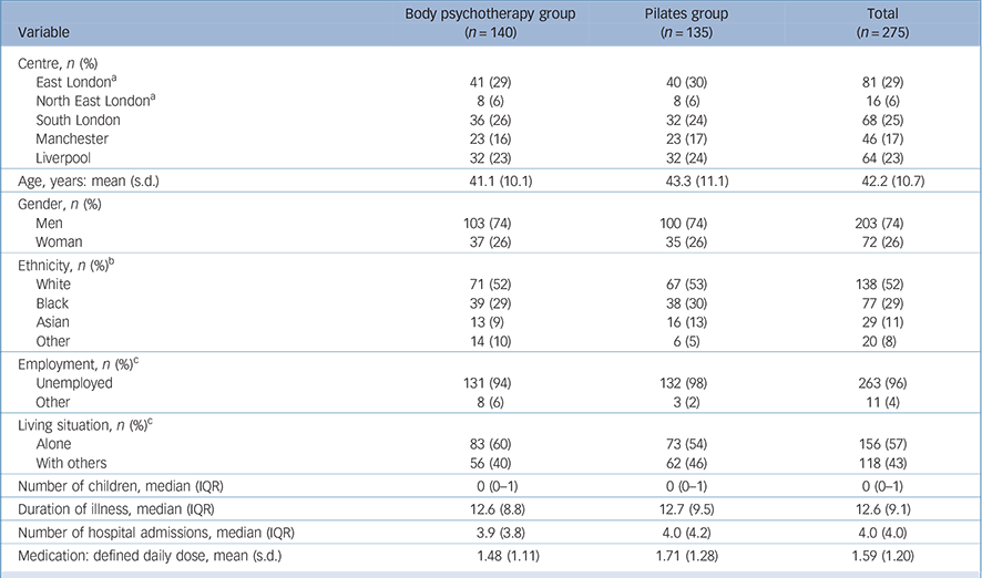 This study was an assessor-masked, two-arm, RCT, approved by the Camden and Islington National Research Ethics Committee (Ref:H0722/44), and the trial is registered (ISRCTN84216587). A detailed study design description is available in the published protocol.Reference Priebe, Savill, Reininghaus, Wykes, Bentall and Lauber15 Participants were recruited from mental health community services in the UK. The inclusion criteria were: diagnosis of schizophrenia (ICD-10 codes F20.0–F20.9),16 aged 18–65 years, a Positive and Negative Syndrome Scale (PANSS) negative subscale score ➮18,Reference Kay, Flszbein and Opfer17 no change of antipsychotic medication for 6 weeks, a willingness and ability to consent and participate, and a sufficient command of English to complete the research interviews and actively participate in group interactions in English. Participants were randomised into a manualised, 20-session body psychotherapy group, or a 20-session beginner's-level Pilates class, in addition to standard care.