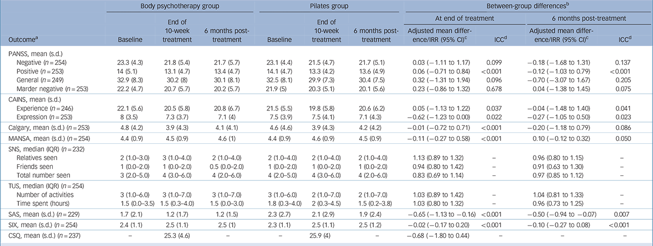 Outcomes are shown in Table 2. There was a small reduction in mean PANSS negative symptoms between baseline and end of treatment in both groups (within-group mean reduction in the body psychotherapy group 1.5 (s.d. = 3.5); Pilates group 1.6 (s.d. = 3.8)). After controlling for baseline scores, study centre and therapy group, no significant difference between the experimental and control condition was detected (adjusted mean difference = 0.03, 95% CI −1.11 to 1.17, P = 0.959. Model-based ICC = 0.099).