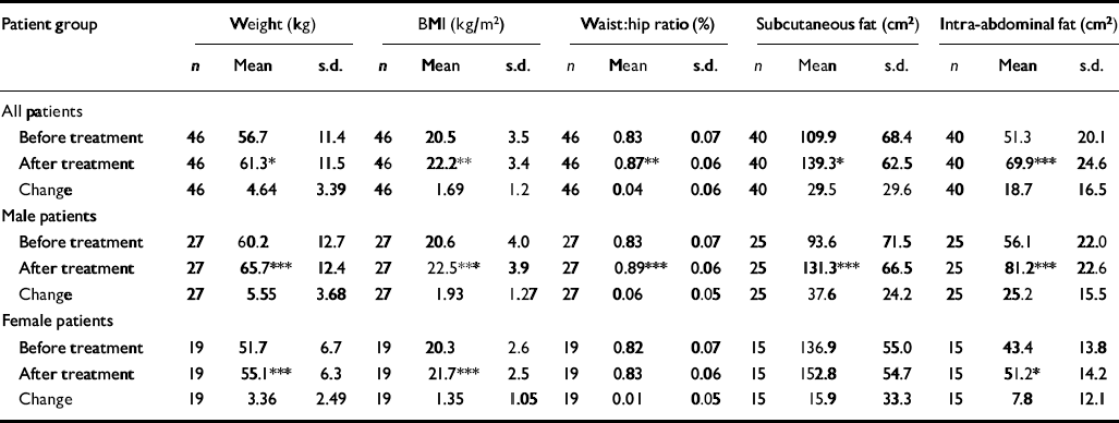 Initial comparisons between the control and patient groups showed no significant difference between the two. Values for the control group were: average weight 60.7 kg (s.d.=9.6); BMI 21.6 kg (s.d.=2.3); WHR 0.81 (s.d.=0.07); SUB 102.9 cm2 (s.d.= 51.6); and IAF 47.3 cm2 (s.d.=13.8). The general absence of any gender–group interaction indicated that this effect held true within the genders except for a significant interaction term for WHR (F=6.03, P=0.016), reflecting a lower WHR in female controls 0.77 (s.d.=0.06) compared with female patients (t=2.469, P=0.019). There were significant increases in all weight and fat indicators after 10 weeks’ antipsychotic treatment in the patient group (Table 2). This showed significant interactions with gender for SUB (F=5.675, P=0.022), and particularly for IAF (F=13.727, P=0.001) and WHR (F=11.574, P=0.001), but not for BMI, reflecting substantially greater changes in the male group than in the female group. Thus no significant change in WHR and SUB was apparent for the female patients after treatment; significant differences between males and females were found for the changes in WHR (t=3.496, P=0.001), SUB (t=2.2, P=0.038) and IAF (t=3.941, P=0.0001).
