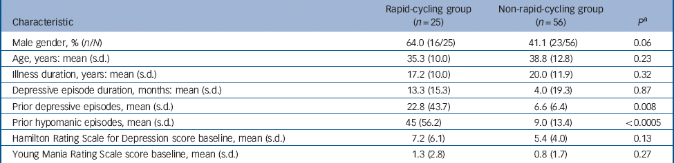 | Characteristic | Rapid-cycling group (n = 25) | Non-rapid-cycling group (n = 56) | P a |