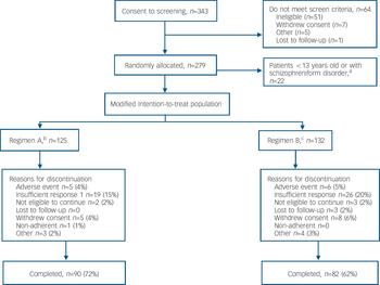 Patients believed by the investigator to be at significant risk for suicidal or violent behaviour during the study were excluded, as were patients with a history of neuroleptic malignant syndrome, tardive dyskinesia, or a known or suspected seizure disorder. Patients with a body mass index (BMI) that was <5th percentile or >95th percentile using the standardised percentile curves for children and adolescents Reference Rosner, Prineas, Loggie and Daniels23 were also excluded to ensure that drug exposure was within defined limits.