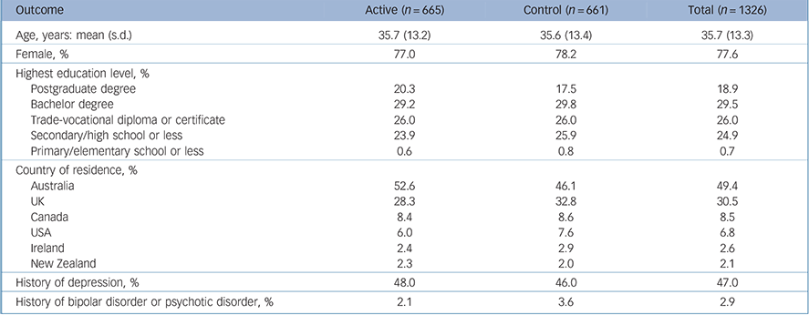 Table 1 presents an overview of the sociodemographic characteristics of the sample. Participants ranged in age from 18 to 78 years, with a mean of 36 years. Over three-quarters of participants were female, nearly half the sample possessed at least a bachelor degree and nearly half reported a history of depression. As can be seen in the table, the two groups were well matched. At pre-intervention, there were no significant differences between the control and active groups on the PHQ-9, K10 and WSAS (Table 2). Reflecting inclusion criteria, scores on the PHQ-9 at pre-intervention were in the mild-to-moderate range (mean = 10.6, s.d. = 1.97). Mood disturbance was present in 46% of the sample. Although participants did not qualify for a diagnosis of major depression, mean scores on the K10 suggested that they had high psychological distress 28 and substantial functional impairment as indicated by mean scores on the WSAS.