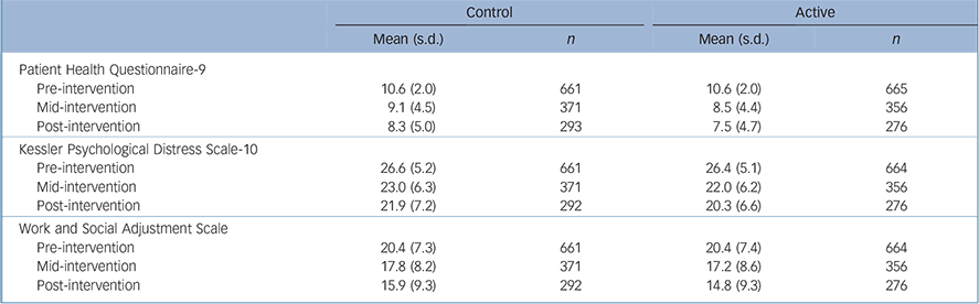 Table 2 shows the means and standard deviations of the primary and secondary outcomes at each measurement occasion for each group. The overall interaction of time and group was significant for the PHQ-9 (F(2,647.4) = 3.10, P = 0.046). Planned contrasts showed that the active group improved significantly more than the control group on the PHQ-9 between pre- and post-intervention (t(627.4) = 2.32, P = 0.02). The mean difference in improvement was 0.91 points (95% CI 0.14–1.69). The effect size post-intervention was d = 0.17 (95% CI 0.01–0.34). Although the overall interaction between time and group for the K10 was not statistically significant (F(2, 655.9) = 2.62, P = 0.074), there was a significant difference between groups in change from pre-intervention to post-intervention (t(639.2) = 2.22, P = 0.027). The active group showed a mean improvement of 1.2 points (95% CI 0.13–2.21) more than the control group on the K10 scale (d = 0.22, 95% CI 0.05–0.38). The interaction between time and group for the WSAS was not significant (F(2, 664.3) = 1.35, P = 0.261) and there were also no significant differences between groups on the change from pre- to post-intervention (t(655.8) = 1.63, P = 0.104, d = 0.12, 95% CI –0.05 to 0.28).