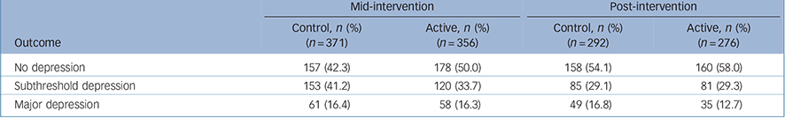 Predictors of intervention outcome were analysed in the active group with multiple linear regression. Higher pre-intervention depression scores were a significant predictor of higher post-intervention scores (b = 0.42, s.e. = 0.15, P = 0.005). Controlling for pre-intervention depression and other predictors, lower post-intervention depression scores were predicted by older age (b = –0.06, s.e. = 0.02, P = 0.005) and no history of depression (b = 1.58, s.e. = 0.57, P = 0.007). Higher coping self-efficacy was significantly associated with lower depression post-intervention when controlling for pre-intervention depression (b = –1.19, s.e. = 0.56, P = 0.036), but not when controlling for other predictors.