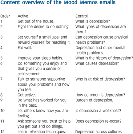 The administration of the intervention was fully automated using PHP 5 and a MySQL 5 database. Participants were sent a Mood Memos email twice a week for 6 weeks by the automated system and had no interaction with a therapist. The active group received emails based on self-help strategies endorsed as effective and feasible by depression experts. Reference Morgan and Jorm11 The control group received emails containing general information about depressive disorders (see Appendix for an overview of the content of each Mood Memos email). The design of the active Mood Memos was a crucial component of the study, as merely providing information is not sufficient to change behaviour. The emails employed a variety of techniques to encourage and persuade the recipient to engage in the self-help behaviours. Reference Morgan, Jorm and Mackinnon8 These included persuasive framing, tailoring, goal setting and limiting cognitive load. The emails included an explanation of each strategy, why it would work, tips on how it could be implemented, suggested solutions for implementation barriers, an appeal to commit to implementing the strategy and a reminder about previous strategies. The strategies were ordered in terms of their feasibility to carry out, with the most feasible strategy sent first. Feasibility rankings were taken from the original expert consensus study. Reference Morgan and Jorm11 The control group Mood Memos did not direct any action and were designed not to have any therapeutic value. Their role was to control for the effect of receiving emails with depression-related content.