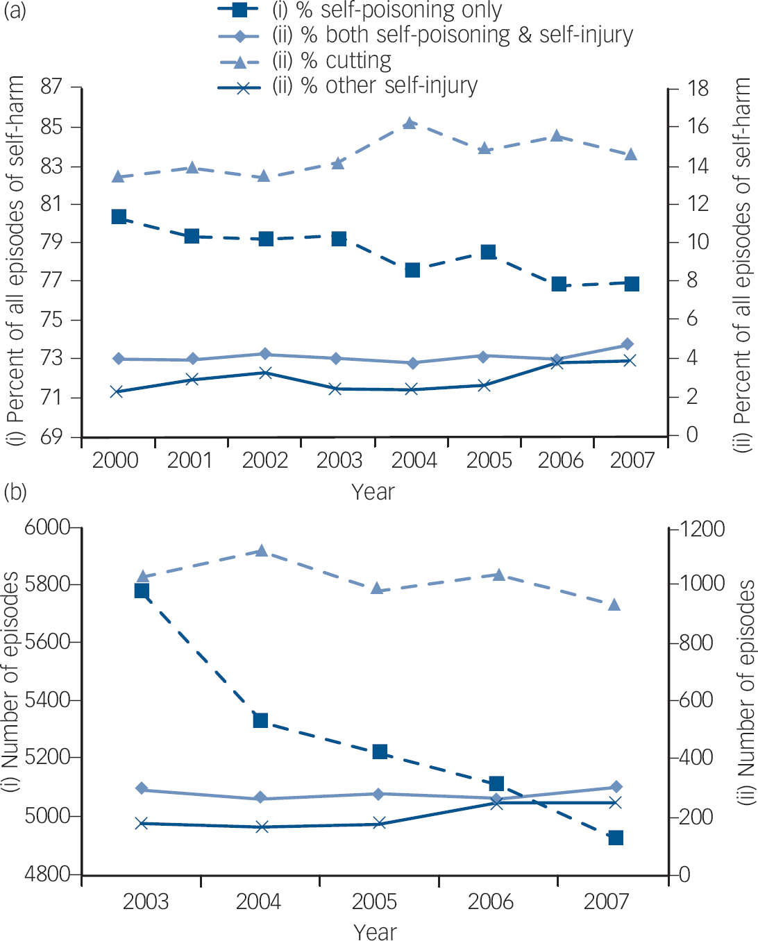 ‘Cutting only’ as a proportion of all self-harm during 2000 to 2007 showed a small increasing trend of 8% (χ2 for trend: 8.9, P = 0.003) (Fig. 2a). However, the number of episodes of cutting decreased by approximately 10% during 2003 to 2007 (Fig. 2b).
