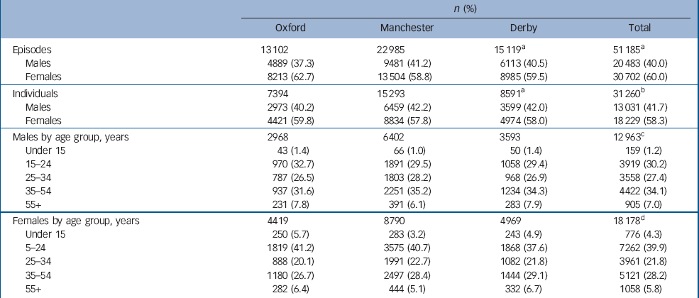 Following self-harm, most individuals received a psychosocial assessment (of mental state, risks and needs) by specialist psychiatric clinicians (and in Manchester also by emergency department staff), Reference Kapur, Murphy, Cooper, Bergen, Hawton and Simkin16 in line with clinical guidance. 17,18 Demographic, clinical and hospital management data on each episode were collected by clinicians using forms, in Oxford and Manchester. In Derby, data were entered directly into a computerised system by clinicians. Individuals not receiving an assessment were identified through scrutiny of emergency department and medical records (computerised records in Derby), from which more limited data were extracted by research clerks. In all centres, individuals not assessed may have taken early discharge, refused the offer or not been offered an assessment for clinical reasons or unavailability of staff.