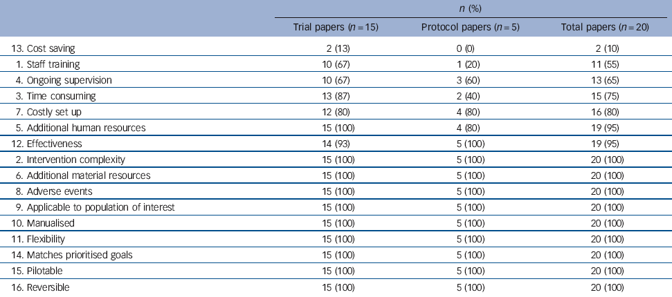 Ninety-five implementation influences (i.e. barriers and facilitators) were identified from the 11 included papers. A total of 39 of these 95 influences related to the characteristics of the intervention so were retained and included in the vote counting (online Appendix DS1).