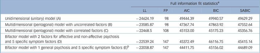 | Bifactor model with 1 general psychosis and 5 specific symptom factors (E)b | −22058.87 | 147 | 44411.75 | 45156.02 | 44689.09 |