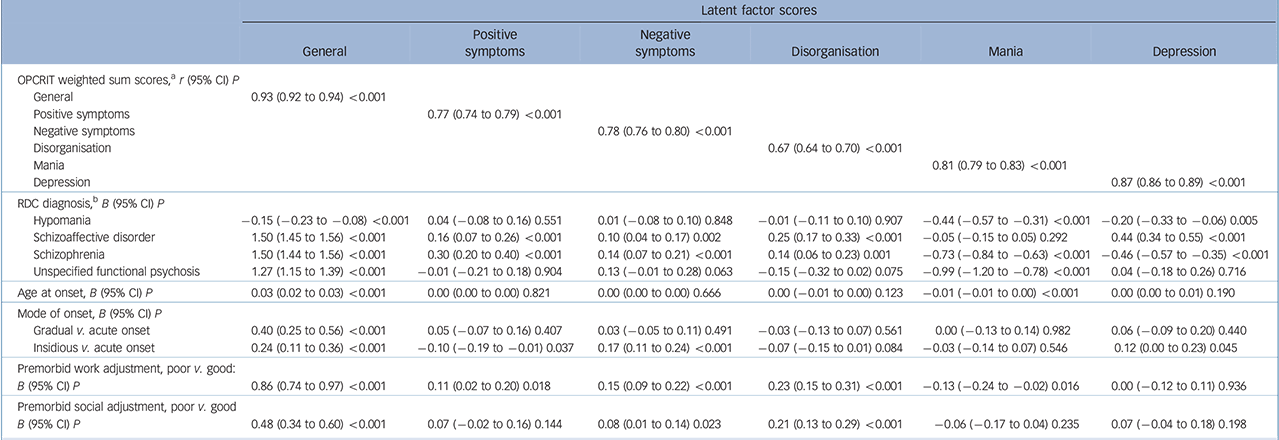 All latent factor scores were strongly and positively associated with weighted OPCRIT sum scores for general and specific psychosis dimensions (Table 2). This indicated that higher weighted sum scores on a particular dimension can be interpreted as representations of higher latent factor scores.