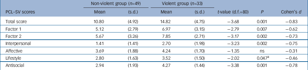 PCL-SV scores Mean (s.d.) Mean (s.d.) t-value (d.f.=80) P Cohen's d
