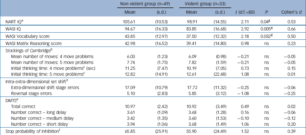 This is one of the few studies comparing violent and non-violent forensic in-patients with schizophrenia on measures of neuropsychological function using a well-validated culture-free computerised test battery that distinguishes putative DLPFC and VLPFC functions. We also compared the groups on measures of symptoms and measures of psychopathy as these variables have also been reported to be associated with violence in schizophrenia (for example, symptoms, Reference Cheung, Schweitzer, Crowley and Tuckwell25,Reference Taylor, Leese, Williams, Butwell, Daly and Larkin26 psychopathy Reference Tengstrom, Grann and Langstrom27Reference Dolan and Davies29 ).