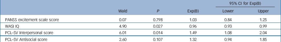 A logistic regression was carried out using the enter method for the prediction of non-violent v. violent group status. Current IQ, PANSS excitement scale score and PCL–SV interpersonal and antisocial facet scores were entered as independent variables into the regression in one block. A total of 82 cases were included in the regression analysis. The Hosmer and Lesmeshow Test indicated reasonable goodness of fit (χ2=8.85, d.f.=8, P=0.36). The Nagelkerke R2 was 0.33. The model was significant (χ2=22.84, d.f.=4, P=0.001), overall correct classification was 74.4%. As can be seen in Table 5, current IQ score and PCL–SV interpersonal facet score contributed significantly to the equation. The PANSS excitement scale score and PCL–SV antisocial facet score did not contribute significantly.