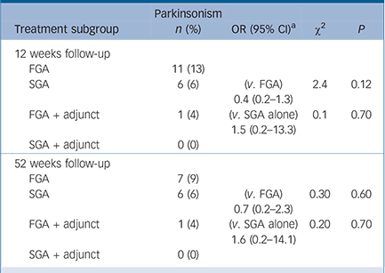 Table 2 describes the two treatment groups according to EPS at 12 weeks and 52 weeks, stratified into EPS that were emergent or resolved. There was no statistically significant difference between the groups in terms of emergent Parkinsonism, akathisia or tardive dyskinesia at either assessment point. Potentially clinically relevant differences in akathisia and Parkinsonism at 12 weeks in the second-generation group, both with odds ratios of 0.5 or less, did not reach statistical significance and were no longer present at the 52-week follow-up. Indication of a clinically significant increase in the development of tardive dyskinesia in the same group at 12 weeks (OR = 2.2, 95% CI 0.6–7.8) was similarly unconfirmed at conventional levels of statistical significance, and had disappeared by 52 weeks (OR = 1.0, 95% CI 0.4–2.9). These results suggest, overall, a null effect at 1-year follow-up.