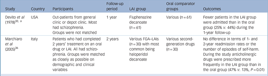 | Devito et al (1978) Reference Devito, Brink, Sloan and Jolliff32, a | USA | Out-patients from general clinic or depot clinic. Most had schizophrenia. Groups were not matched | 1 year | Fluphenazine decanoate (n = 61) | Various (n = 61) | Fewer patients in the LAI group were admitted than in the oral group (25% v. 44%) during the 1-year follow-up |