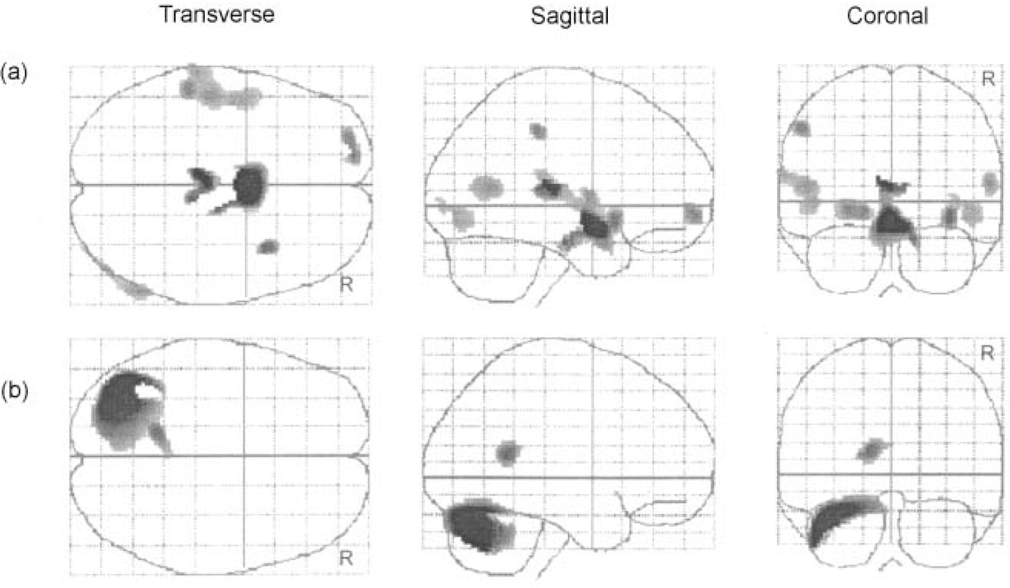 Fig. 1 Statistical parametric maps displaying abnormalities in grey matter density in patients with obsessive—compulsive disorder: (a) increased areas; (b) decreased areas.