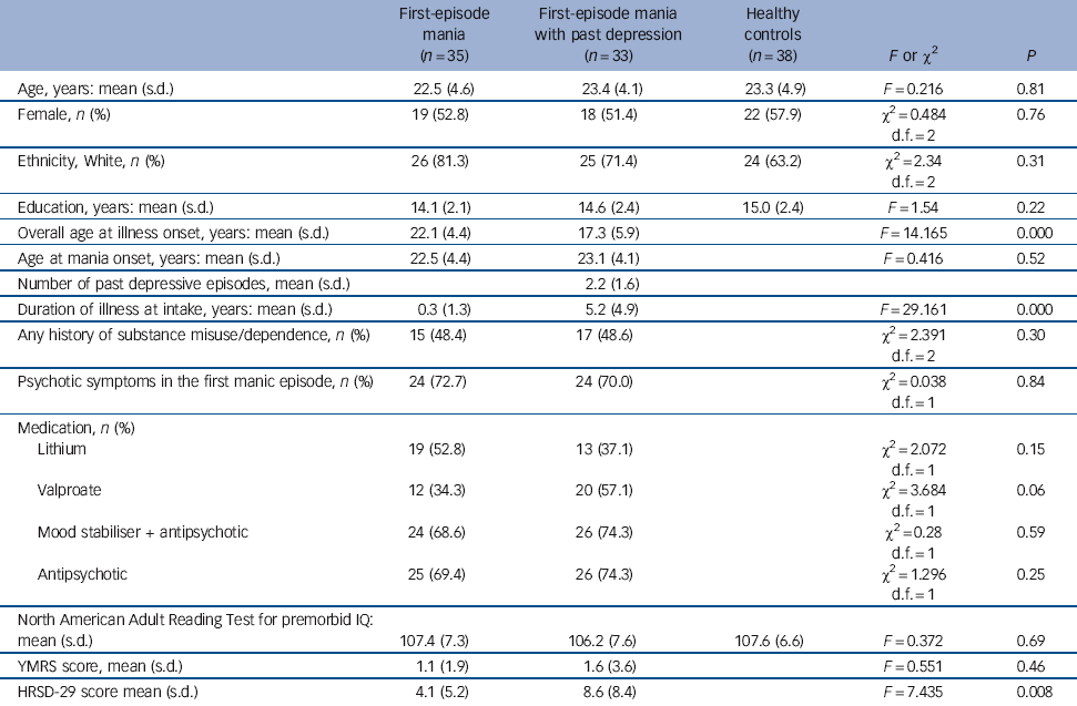 The three groups - FEM (n = 35), FEMD (n = 33) and healthy controls (n = 38) - were comparable on age, gender, handedness, education, ethnicity, premorbid IQ and age at onset of the first manic episode (all P>0.17). The FEMD group had an average of 2.2 (s.d. = 1.6) depressive episodes prior to the first manic episode. The onset of illness was, as expected, earlier in the FEMD group compared with the FEM group. Of the 33 patients in the FEMD group, only 4 received antidepressants for the prior depressive episode. The FEMD group showed a significantly higher score on the HRSD-29 compared with the FEM group (mean 8.7 (s.d. = 8.4) v. mean 4.1 (s.d. = 5.2); F = 7.4, P<0.05). There was a trend for more patients in the FEMD group to be treated with valproate than in the FEM group (χ2 = 3.7; P = 0.055). A comparison of the demographic and clinical variables is provided in Table 1.