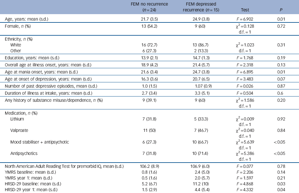 The two FEM groups - NR group (n = 24) and DR group (n = 15) - were comparable on gender (χ2 = 0.128; P = 0.72), education (P = 0.19), ethnicity (White; χ2 = 1.023; P = 0.31), premorbid IQ (P = 0.82) and on the number of depressive episodes prior to the first manic episode (P = 0.89). Eleven patients from the FEMD group in the cross-sectional analysis were part of the DR group in the prospective analysis.