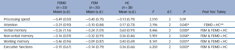 | Verbal memory | −0.26 (1.16) | −0.24 (1.01) | 0.60 (0.91) | 8.446 | 2 | 0.000Footnote * | FEM & FEMD<HC |