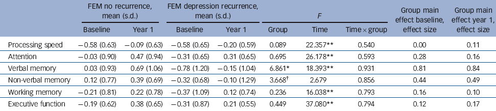 Demographic and clinical variables of the FEM group with no recurrence (NR group) and the FEM group with depression recurrence (DR group) were compared using one-way ANOVA for continuous variables and chi-squared for categorical variables. The change in performance on neurocognitive domains over time was compared between the two groups using repeated measures analysis of variance, with a focus on the group×time interaction. The time and group main effects were also evaluated. Effect sizes were calculated using Cohen’s d.