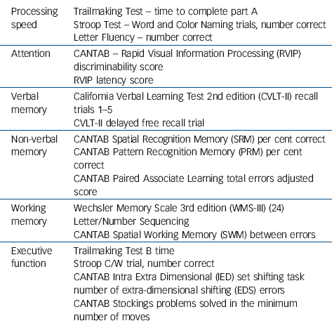 Analyses were conducted using SPSS for Windows, Version 20.0 (SPSS Inc, Chicago, Illinois, USA). For analysis of cognitive data, raw scores for each measure were converted to demographics-corrected z-scores based on norms published in accompanying testing manuals. The z-scores for all measures contained within a cognitive domain were averaged to obtain a mean cognitive domain score. Based on prior work, Reference Torres, Kozicky, Popuri, Bond, Honer and Lam35 test-retest reliabilities for domain scores in healthy volunteers were as follows: processing speed, r = 0.93; attention, r = 0.71; verbal memory, r = 0.68; non-verbal memory, r = 0.73; working memory, r = 0.71; and executive functions, r = 0.77.