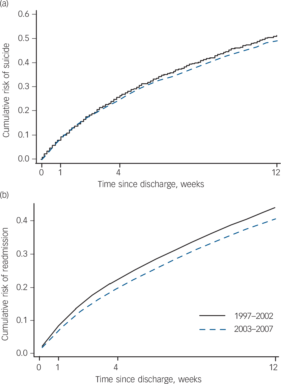We use the log-rank test to compare the equality of survival functions in 1997–2002 v. 2003–2007 across the critical first 12 weeks after discharge. Poisson regression models were used to estimate the change across the study period in the risk of fatal or non-fatal self-harm in the early weeks after psychiatric hospital discharge. The risk in a particular period was calculated as the number of events in that period divided by the number of people who had not yet experienced an event at the beginning of that period. For example, the risk of an event during the 2–4 week period was calculated as the number of events in that period divided by the number of people who had not already experienced an event during the 0–1 week period. Evidence of a linear trend in these risks across the study period was evaluated by including year as a covariate in the regression model. The risks before (and including) 2002 – the year before policy changes regarding post-discharge psychiatric care were introduced – were compared with those in 2003–2007 by including a dummy variable in the models (0, 1997–2002; 1, 2003–2007). All models included a dummy variable distinguishing male and female patients. We investigated whether any changes in risk of fatal or non-fatal self-harm risk over time differed between men and women and between younger v. older patients (using median age in each data-set as the cut-off point) by including interaction terms.