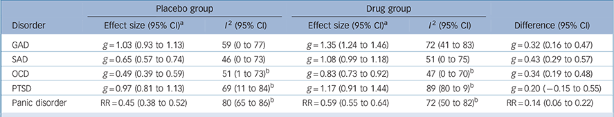 We performed a meta-analysis of effect sizes, stratified by disorder and group (Table 1). The placebo group effect size was smallest for OCD (0.49), followed by SAD (0.65). These placebo effects were 59% and 60% respectively of the effects found for the corresponding drug groups. In contrast, for GAD and PTSD the placebo effect sizes were 1.03 and 0.97 respectively; these effects were 76% and 83% respectively of the effects found for the corresponding drug groups. For panic disorder the placebo remission rate was 45%, which was 76% of the rate found in the drug group. Substantial heterogeneity was present for nearly all groups, with I 2 ranging from 46% for the placebo groups in SAD trials to 89% for the drug groups in PTSD trials, although confidence intervals were generally wide.