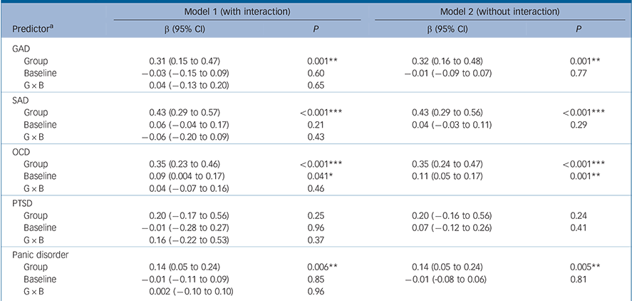 All analyses were performed in Stata 13. We performed meta-analyses using the metan command, applying a random effects (DerSimonian–Laird) model to obtain summary statistics by disorder and group. To measure heterogeneity, the heterogi module within Stata was used to calculate I 2 and its 95% confidence interval. Reference Ioannidis, Patsopoulos and Evangelou27 Meta-regression was then performed separately per disorder using the metareg command. All meta-regressions were based on a mixed effects model, used restricted maximum likelihood (REML) estimation of the residual between-study variance, and included group, baseline severity and their interaction as predictors. The dependent variables were Hedges' g for GAD, SAD, OCD and PTSD and remission rate for panic disorder. Studies were weighted according to the inverse of their variance. For OCD, PTSD and panic disorder, meta-regression estimates from the ten multiply imputed data-sets were combined using the mi suite of commands in Stata.
