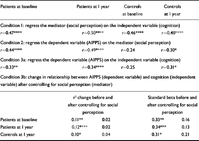 Since all of the above results held for both the SCRT and the SFRT tasks, we used transformed z-scores to combine these two tasks into a composite variable social perception. Results of the regression analyses for QLS as the dependent variable are presented in Table 1 and for the AIPPS in Table 2. There were significant associations between social perception, cognition and social functioning (QLS and AIPPS) at both assessments for the patient group. For the control group, at baseline the AIPPS was not associated with social perception or cognition and at 1 year the QLS was not associated with social perception. These results mean that we test for mediation on both measures at both times for the patient group and for the controls, at baseline for QLS and at 1 year for the AIPPS. For mediation we want to see in condition 3b in Tables 1 and 2 significant reductions in r 2 change and in the standard beta.